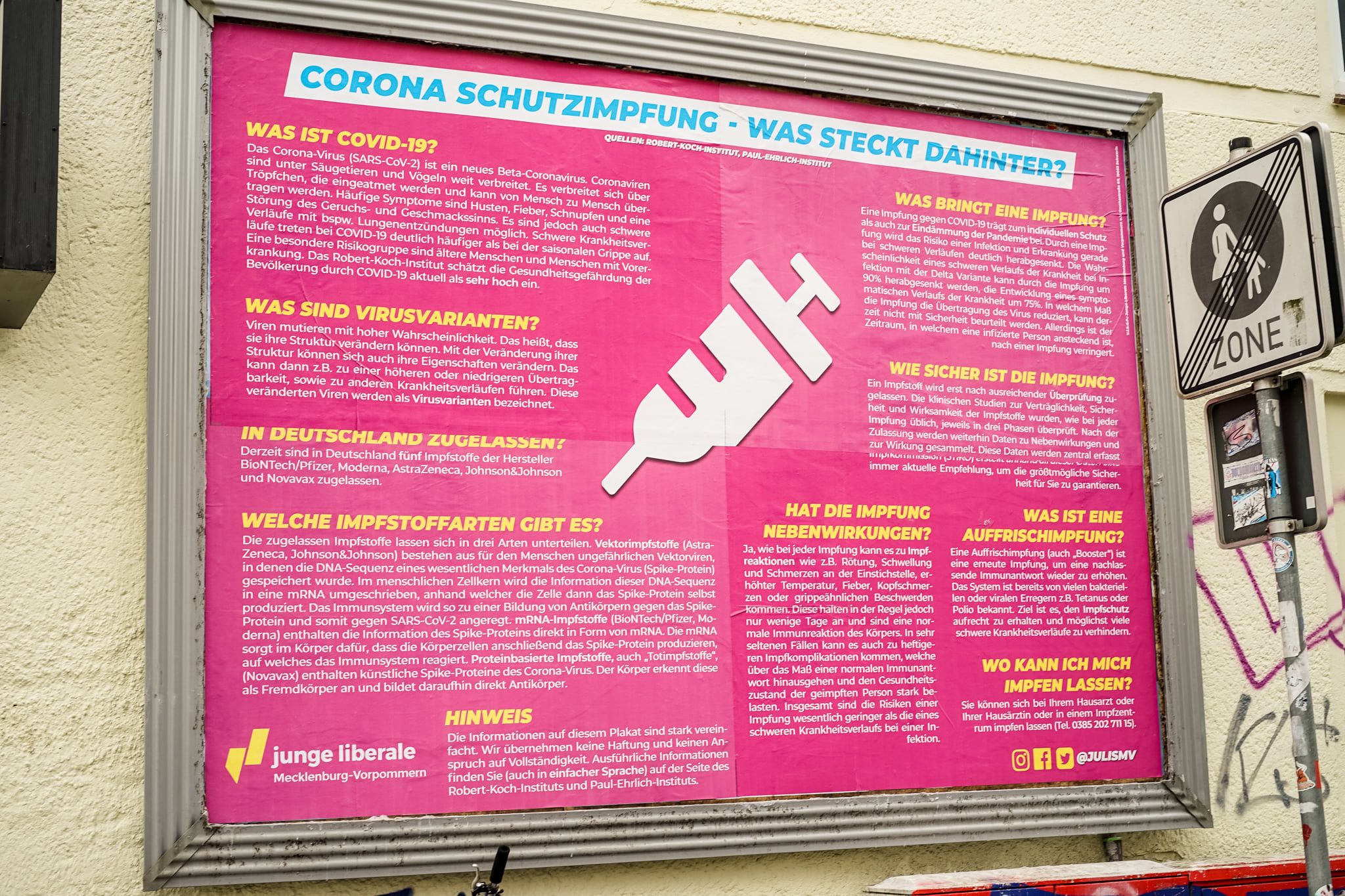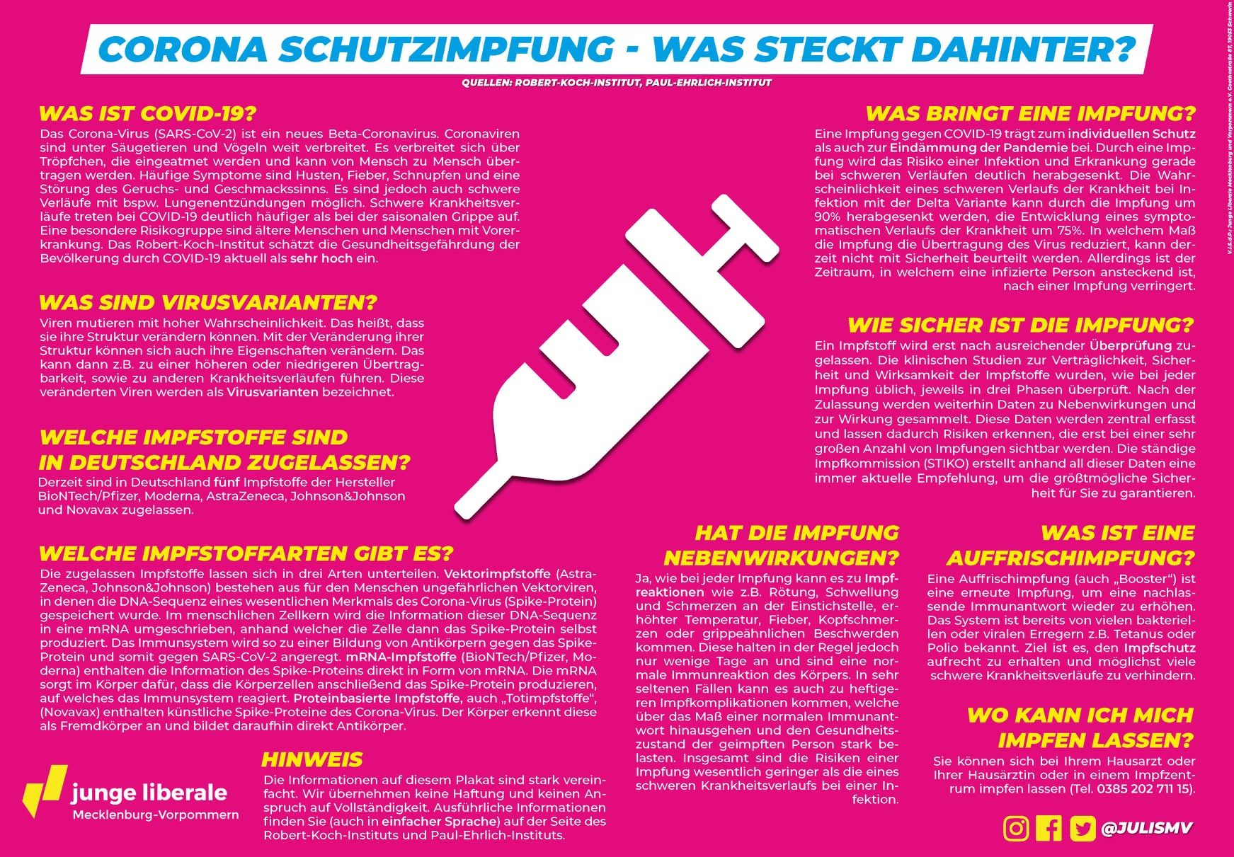 Die Jungen Liberalen Mecklenburg-Vorpommern, Jugendorganisation der Freien Demokraten (FDP), starten heute in Greifswald eine Aufklärungskampagne für die Corona-Schutzimpfung. Auf einer Werbefläche in der Greifswalder Innenstadt (Schuhagen 4) beantworten sie häufig gestellte Fragen rund um die Impfung und klären sachlich und informativ über die Wirkungsweise auf.